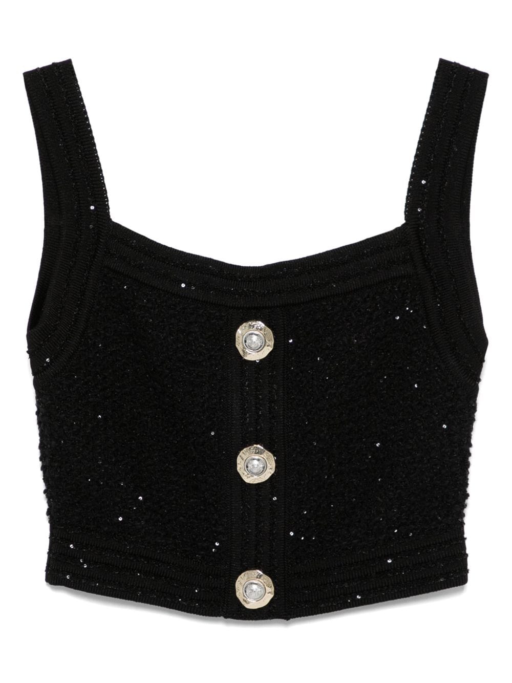 black square neck sleeveless decorative button detailing cropped Tweed top.